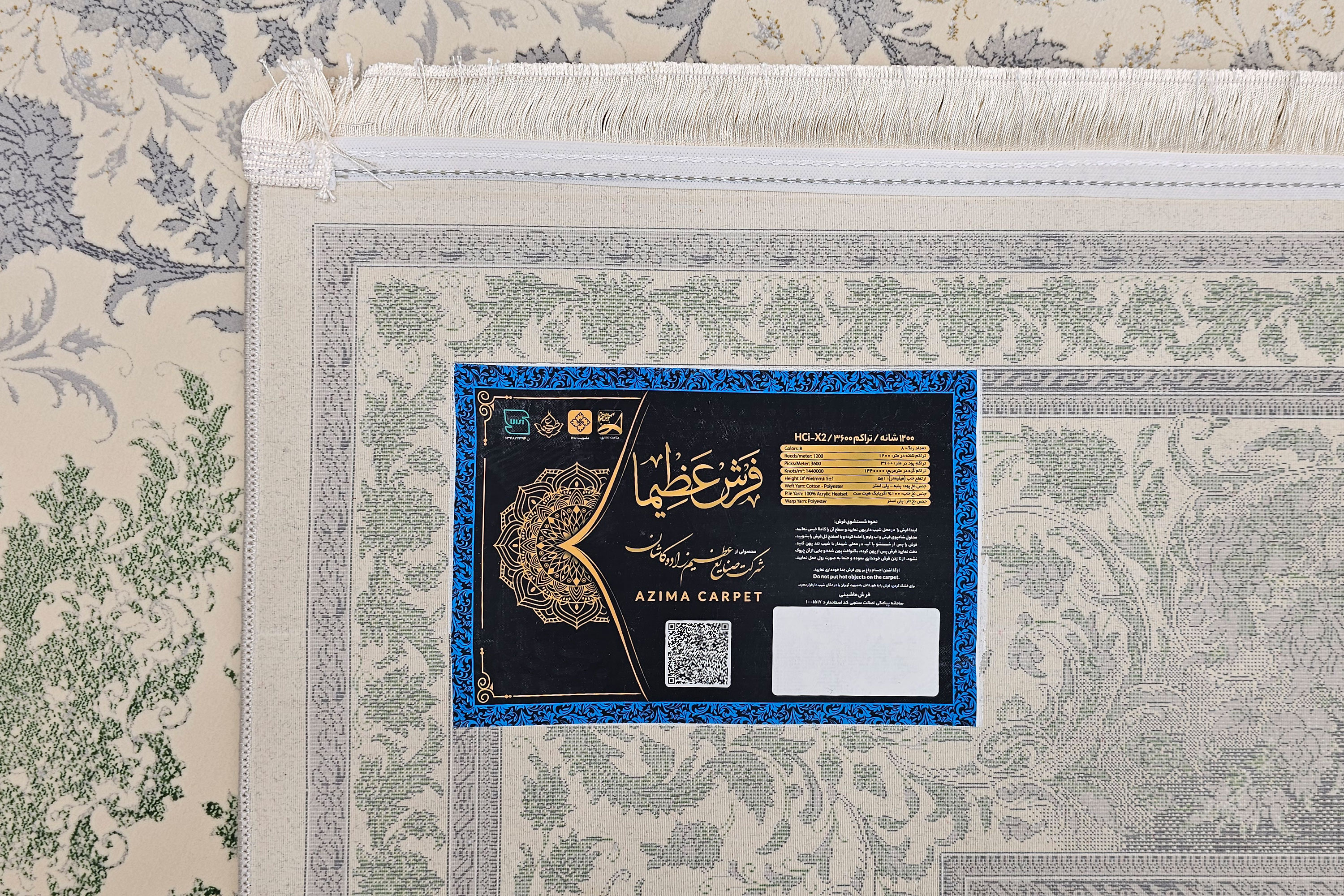 - تراکم شانه و پود: فرش 1200 شانه و پود 3600، که باعث دقت بالای بافت و ظرافت میشود.
