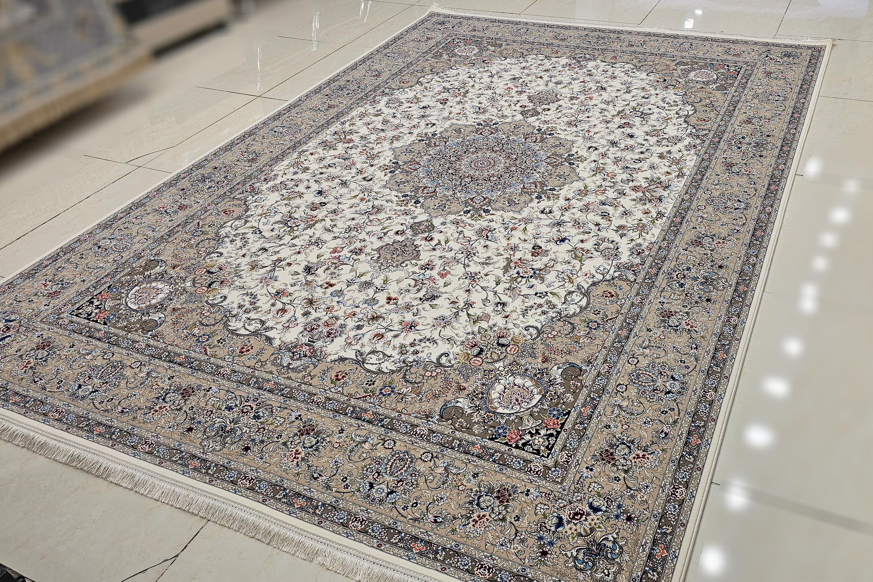 فرش 1200 شانه نگین ابریشم مشهد نقشه ماریا کرم حاشیه بژ دستبافت نما یکی دیگر از محصولات باکیفیت این شرکت است که طراحی آن به سبک مدرنتر و با جزئیات دقیق ارائه شده است. برای نقد و بررسی بهتر، این محصول را با سایر محصولات مشابه مانند نقشه اصفهان مقایسه میکنیم.