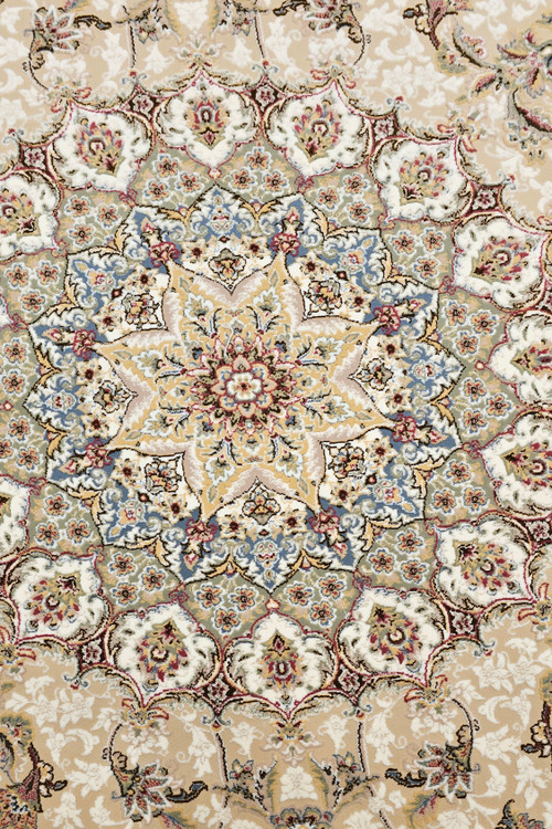 - این فرش با طراحی دایرهای و رنگ کرم صدفی خود، به راحتی با دکوراسیونهای مختلف هماهنگ میشود و فضایی روشن و دلنشین ایجاد میکند.