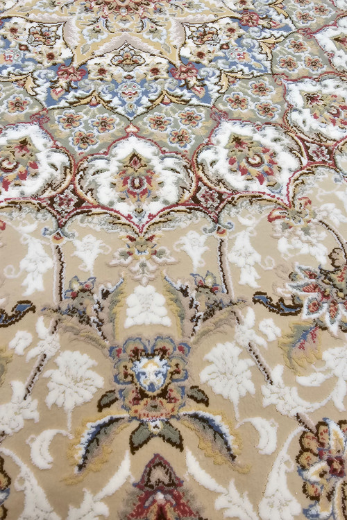 - فرش 1600 شانه دایرهای 1.5 متر خاطره کویر کاشان نقشه افشان سلطنتی صدفی: این قالیچه با شانه و تراکم بالا، یکی از گزینههای مناسب برای فضاهای بزرگتر است. بافت بسیار ظریف و طراحی شیک آن، جلوهای خاص به محیط میبخشد. نقشه افشان سلطنتی با رنگ کرم صدفی، زیبایی و جذابیت زیادی به دکوراسیون شما میدهد. همچنین، کیفیت نخ مرغوب باعث میشود این فرش طول عمر بالاتری داشته باشد.