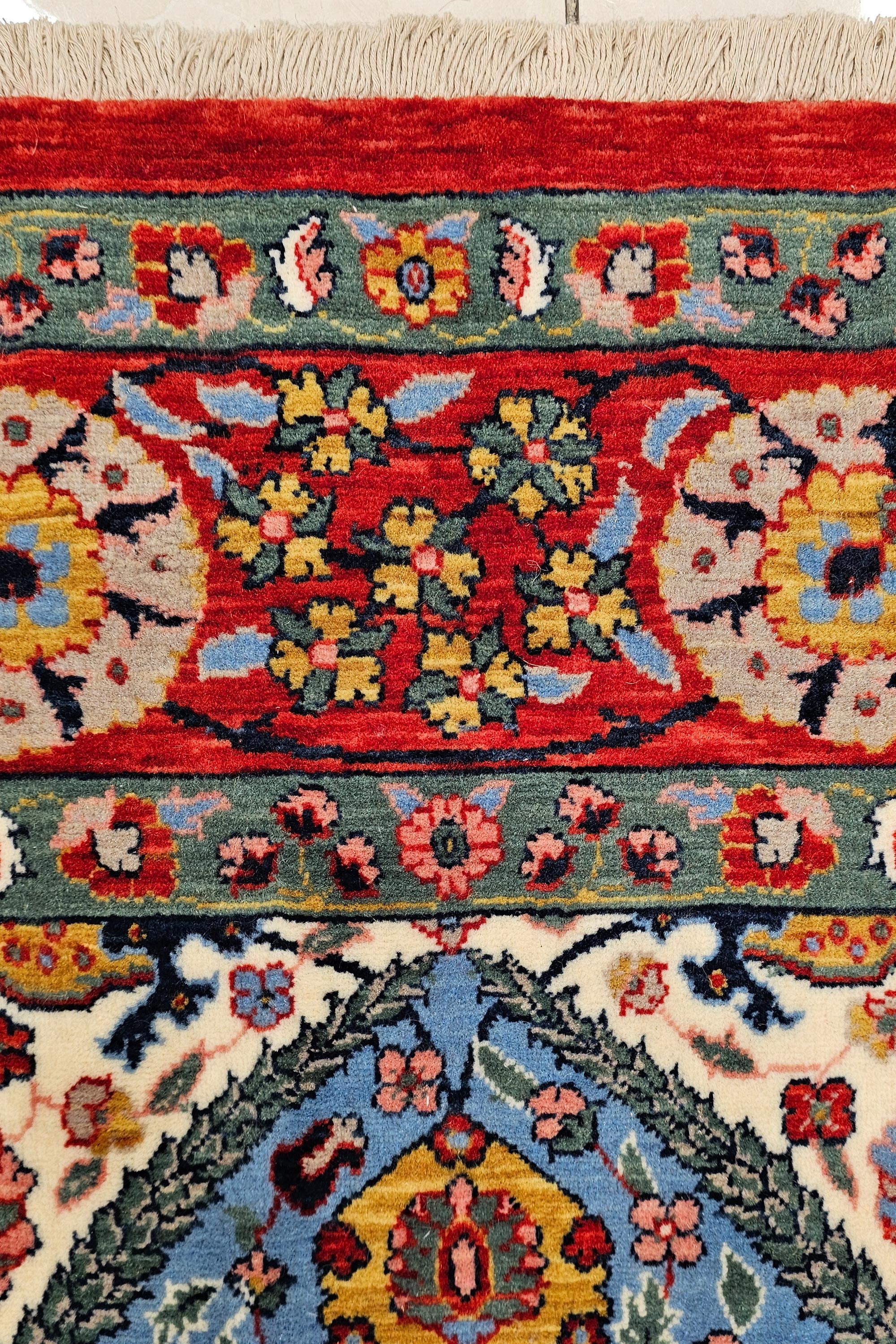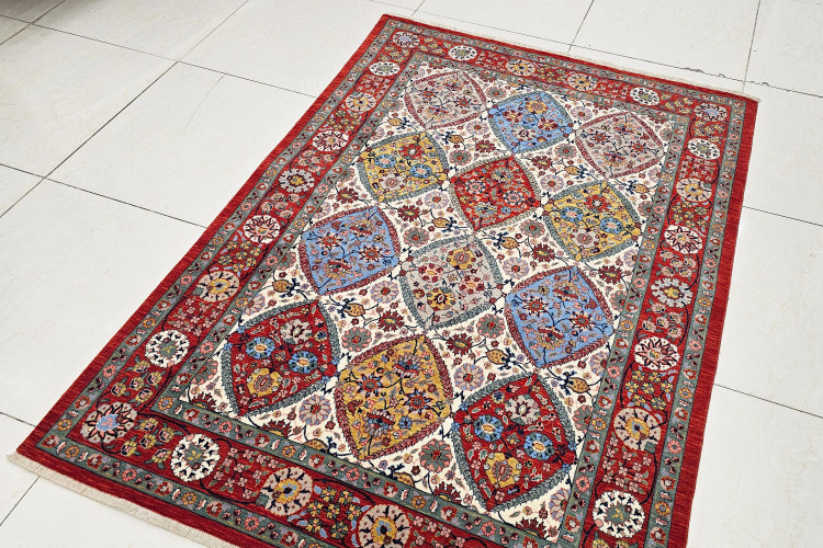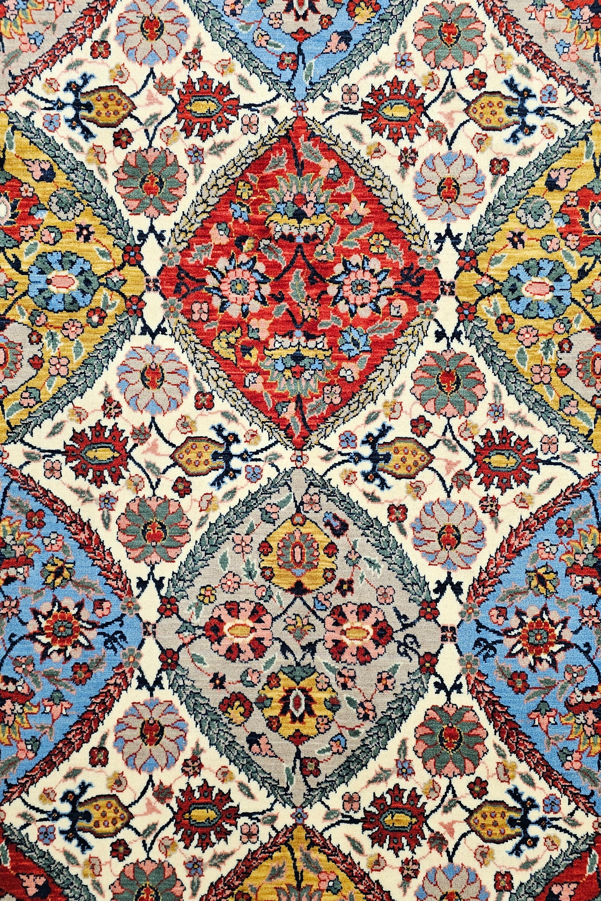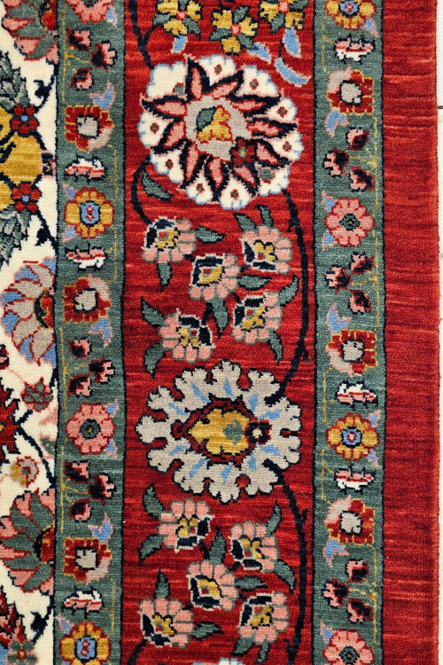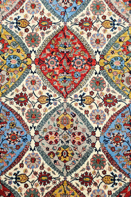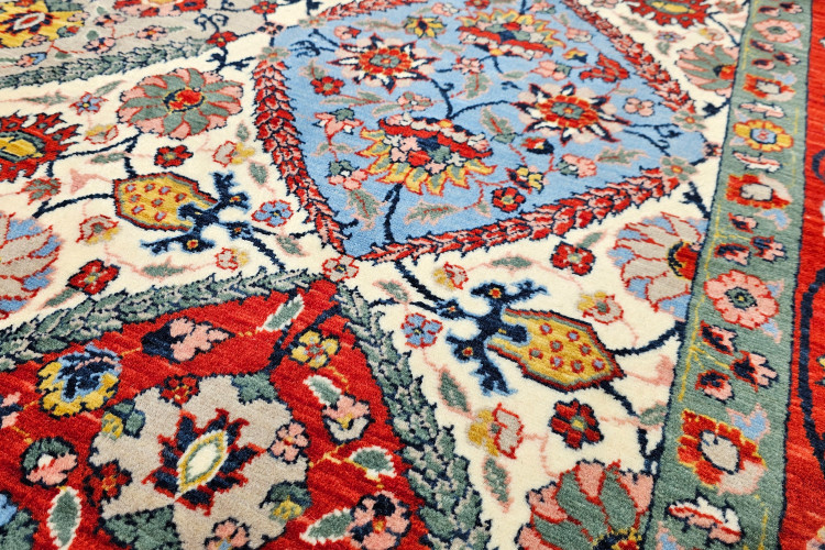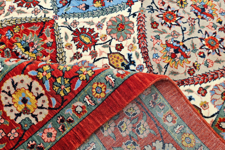 ۳. ظرافت ۴۵ رج دستباف: این محصول با تراکم بسیار بالا بافته شده و از نظر ریزبافتی، معادل یک فرش ۴۵ رج نفیس تبریز یا کاشان است. طرح و نقش آن به قدری زنده و دقیق است که تشخیص آن از نسخه دستباف برای افراد غیرمتخصص غیرممکن است.
